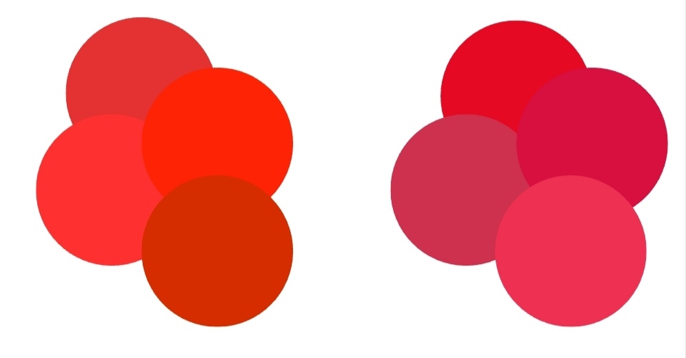 Przykład czerwieni w wersjach cieplejszych i chłodniejszych. Klikając tu zobaczysz artykuł z wizualizacjami zieleni dla różnych typów kolorystycznych.